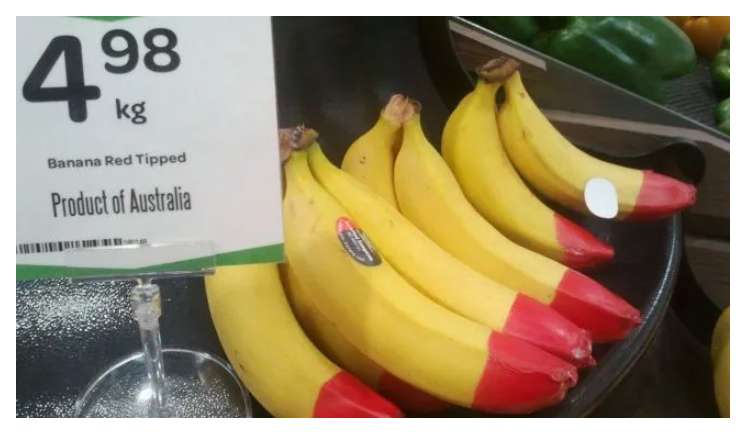 他在Woolworths看到一些香蕉的尾端被染上了鲜艳的红色蜡,于是发出灵魂拷问:“有没有澳洲人能解释一下这到底是啥情况?”