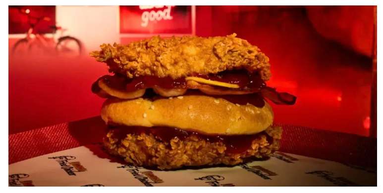 墨尔本吃饭吧微信公众号9日报道,它的构造可以说是脑洞拉满:正常汉堡是肉夹面包,这款直接反过来——两片香脆炸鸡当“面包”,把软乎乎的面包夹在里面,再塞入培根、芝士和新款Stranger酱(番茄风味)。看起来混乱无序,却意外满足,就是那种吃完嘴油但心情爽的邪恶快乐。