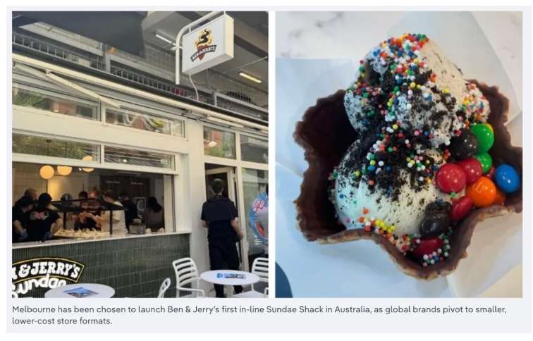 墨尔本吃饭吧微信公众号22日报道,与传统Ben & Jerry’s冰淇淋门店不同,Sundae Shack主打更小面积、更快出餐、更高翻台率。虽然今年早些时候西澳曾出现过摊位形式的Sundae Shack,但Hardware Lane这家门店是澳洲第一家真正意义上的“街铺型”版本。地产与商业人士指出,这一布局并非偶然,墨尔本的巷道文化、全天候客流以及本地与游客并存的消费结构,使其成为新业态测试的理想城市。
