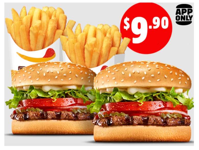 Hungry Jack’s最近在其官方App推出了一项超值优惠:只需9.90澳元,就能在门店取餐时获取2份Whopper Junior和2份中号薯条。这一优惠仅通过Hungry Jack’s App的“Jack’s App Deals”专区可见,是专为App用户准备的限时特价促销。