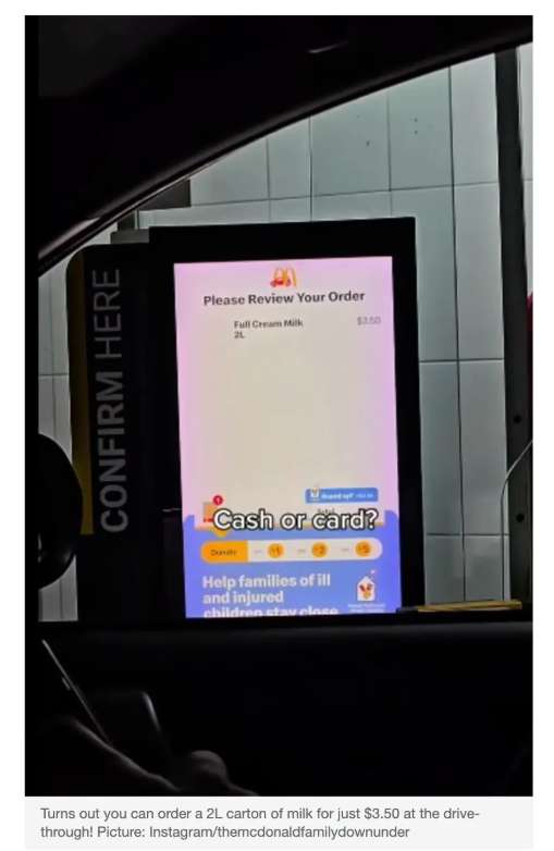一个来自Gold Coast的家庭最近意外揭露了一条鲜为人知的McDonald’s小秘密而引起广泛讨论:在McDonald’s的drive-through竟然可以买到2升的大瓶牛奶,只要约$3.50!许多澳洲网友看到后直呼“怎么现在才知道?”甚至有人表示“以后要常来这里买奶了!”