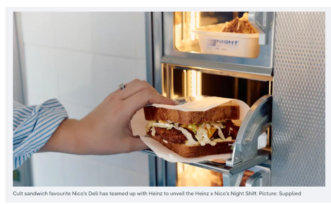 近日,本地知名三明治品牌Nico’s Deli与调味品巨头Heinz合作,在Fitzroy推出了一种全新的“自动售卖餐厅”(automat)模式。顾客无需点单、无需服务员,只需从墙上的透明格子中直接取走三明治。这一项目为期6个月,是墨尔本首个“夜间自动售卖三明治店”,主打快速、便捷的夜宵体验。