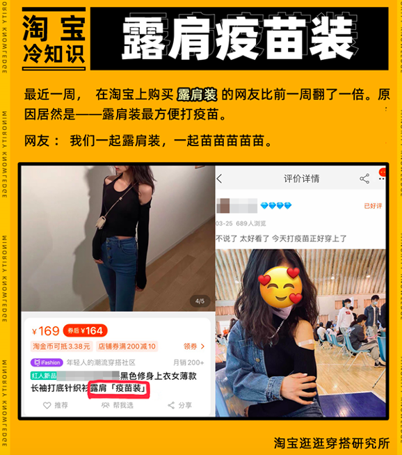 据中国购物平台淘宝数据,最近一周,购买“露肩装”的人数翻倍增长。网民们纷纷晒出自己的露肩装淘宝订单和买家秀:“露肩装简直就是为打疫苗而生的”、“护士就喜欢这样的,坐下就能打”。还有说:又找到了买新衣服的理由了。