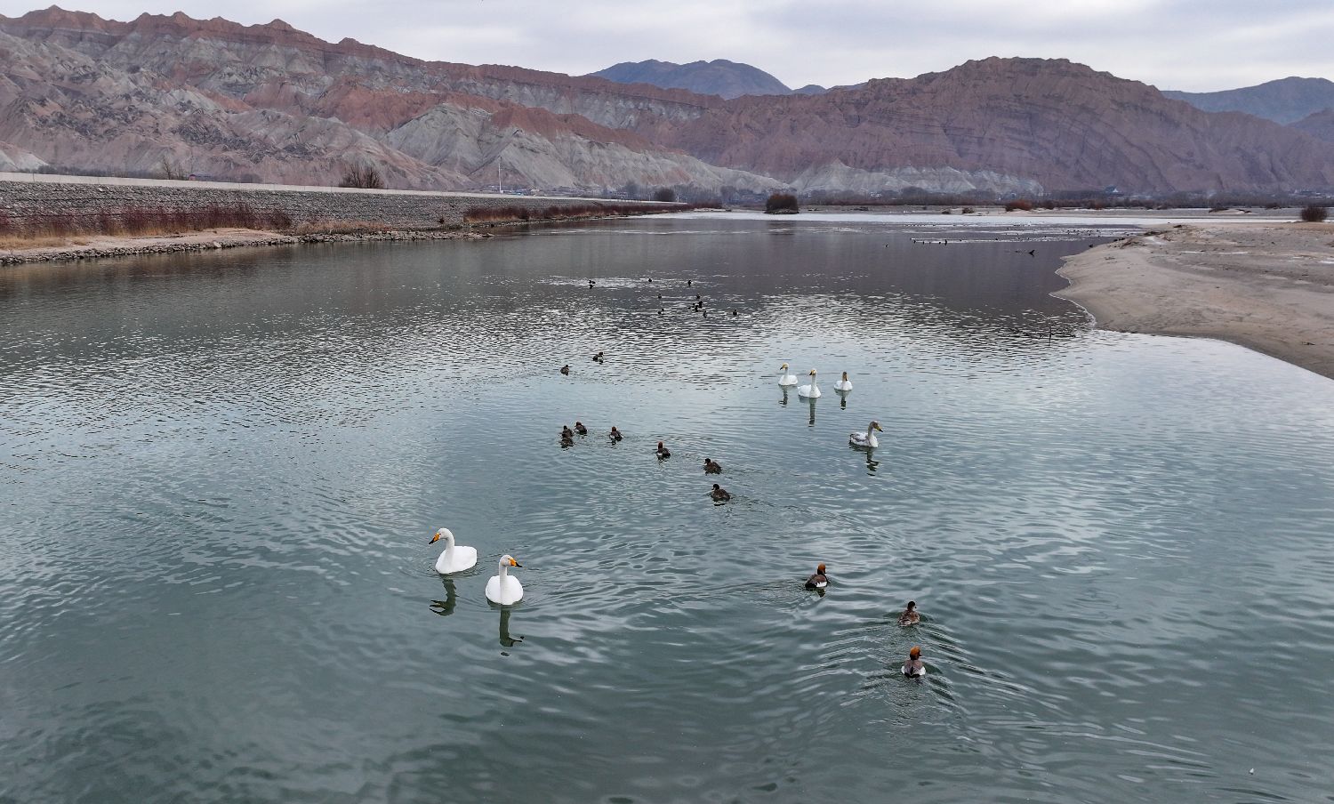 近日,随着北半球气候逐步变暖,鸟类开始春季迁徙。大批越冬候鸟在河流、湖泊与湿地水面停歇觅食,补充长途迁徙所需的能量,往日平静的水面也因为候鸟的到来而变得热闹起来。2月27日,越冬候鸟与丹霞地貌相映成趣。当日,在青海省海南藏族自治州贵德县境内,大天鹅等越冬候鸟在清清的黄河水中,时而游弋,时而嬉戏,与远处壮美的丹霞地貌勾勒出一幅幅充满生机的春日山水画卷。(无人机照片)图片来源:中新社