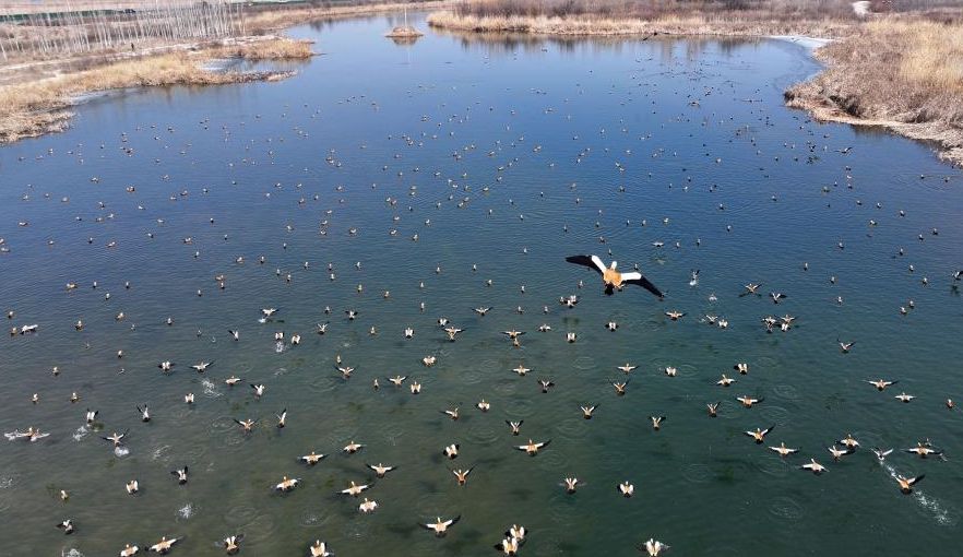 随着天气逐渐转暖,黄河宁夏段迎来众多候鸟驻足。候鸟在黄河宁夏段一处湿地栖息、觅食(无人机照片,2月26日摄)。图片来源:新华社