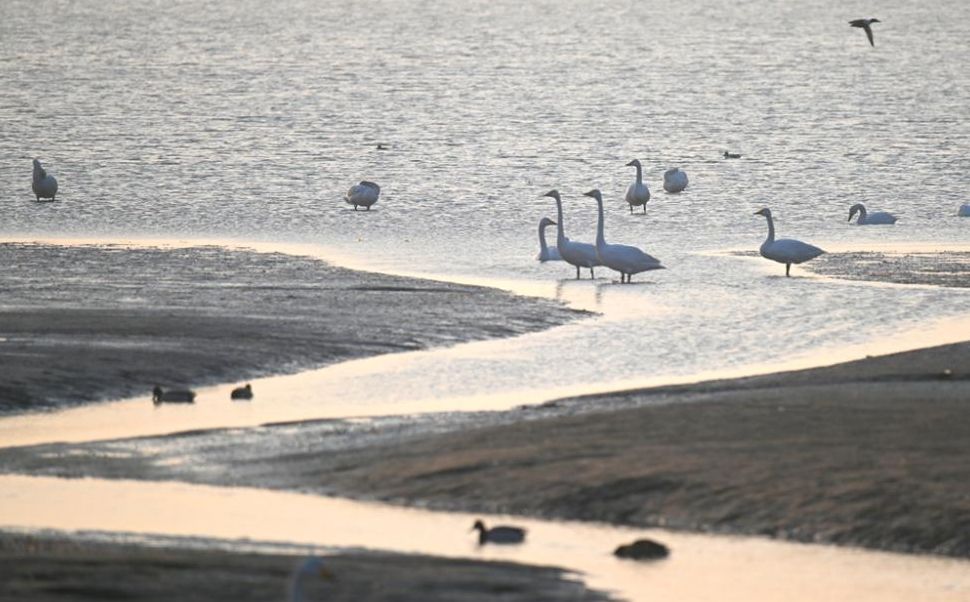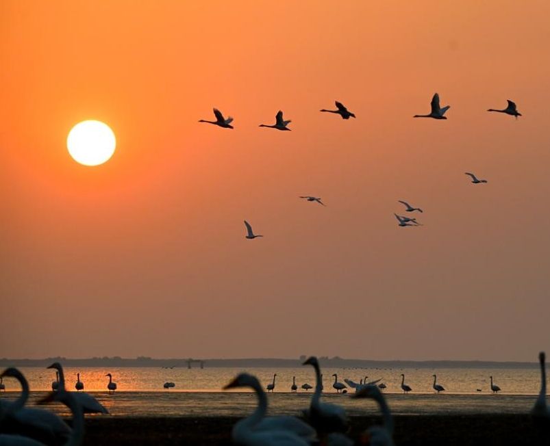 3月6日,山东荣成成山天鹅湖畔,大天鹅在朝阳下盘旋飞舞,告别越冬地向远方飞去。图片来源:中国央视网