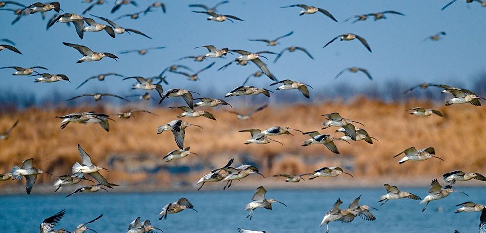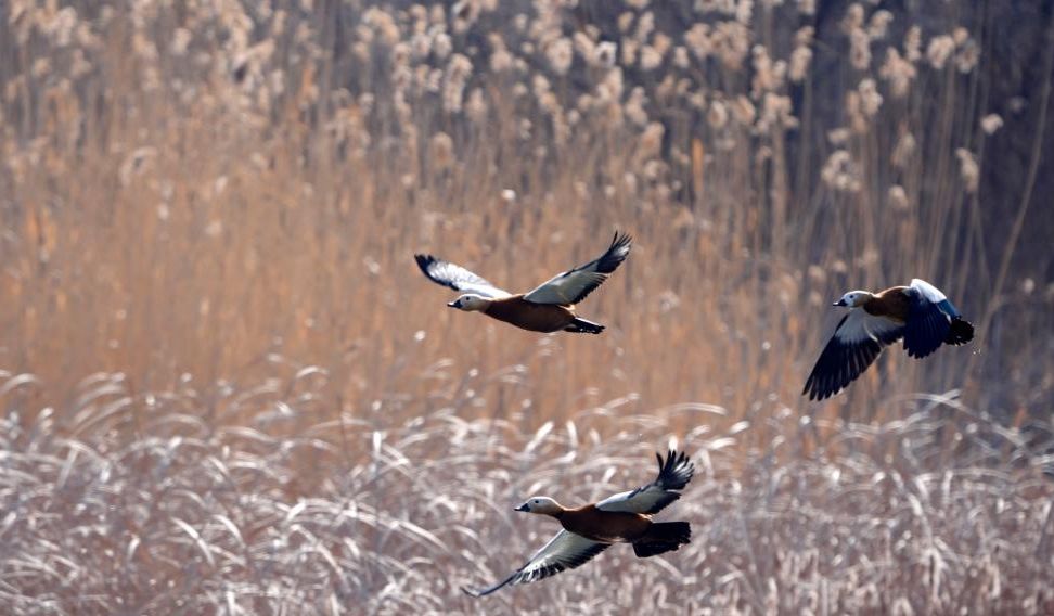 候鸟在黄河宁夏段一处湿地上空飞翔(2月26日摄)。图片来源:新华社