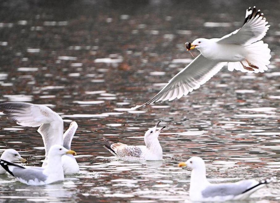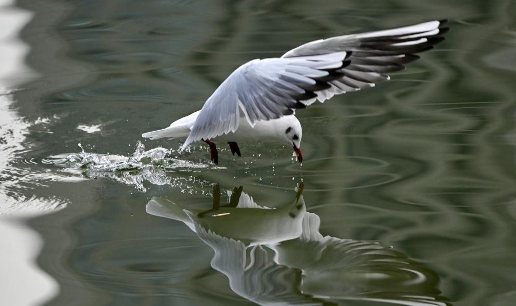 近来,随着气温回暖,大批海鸥在天津市海河沿岸金钢桥附近翔集、觅食。3月4日,一只海鸥在海河上觅食。图片来源:新华社