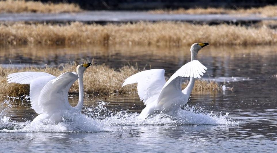 随着气温逐渐回升,大批天鹅、苍鹭等候鸟飞临北京密云水库,在这里栖息觅食、繁育后代。3月4日,天鹅在密云水库流域的清水河内戏水。图片来源:新华社