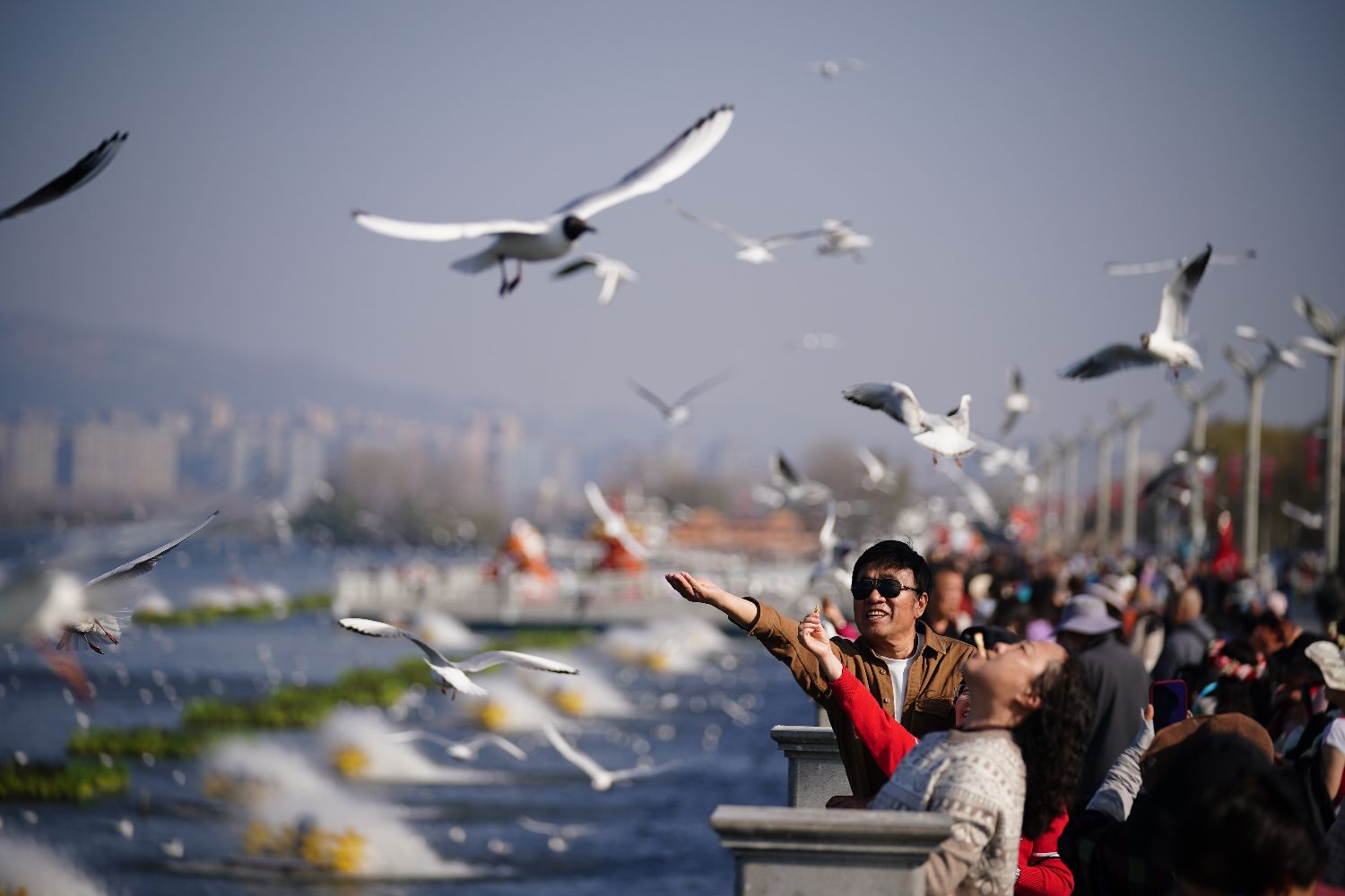 3月5日,游人在滇池边与红嘴鸥互动。随着天气回暖,昆明的越冬红嘴鸥即将踏上回乡的旅程,众多市民和游客来到滇池边,近距离观赏并与红嘴鸥互动。图片来源:中新社