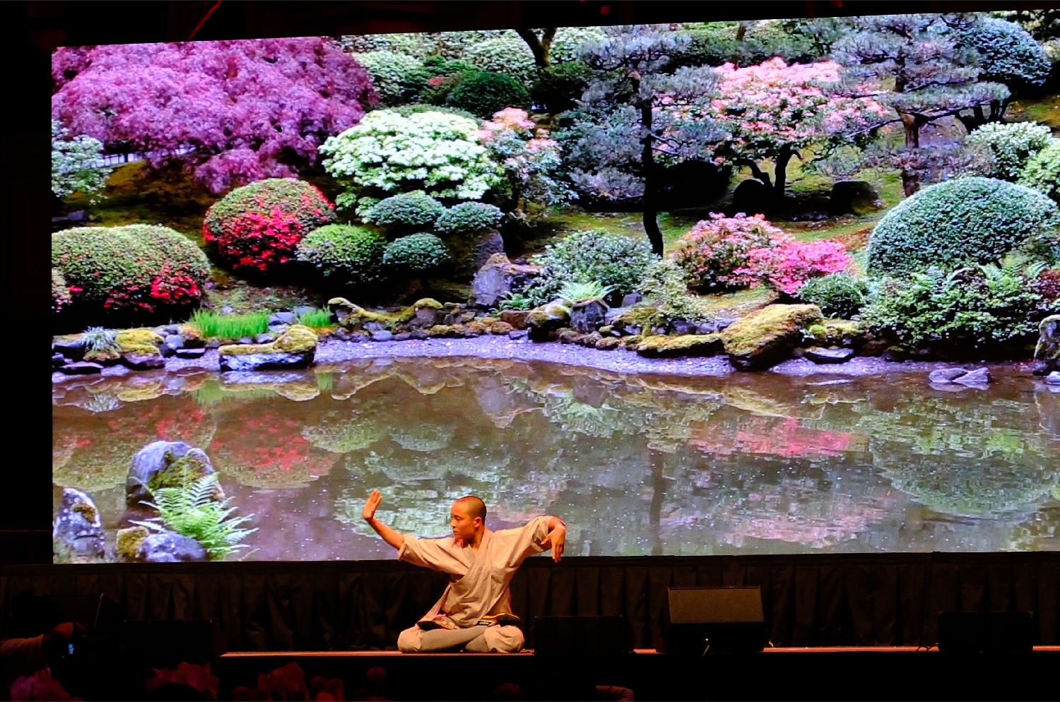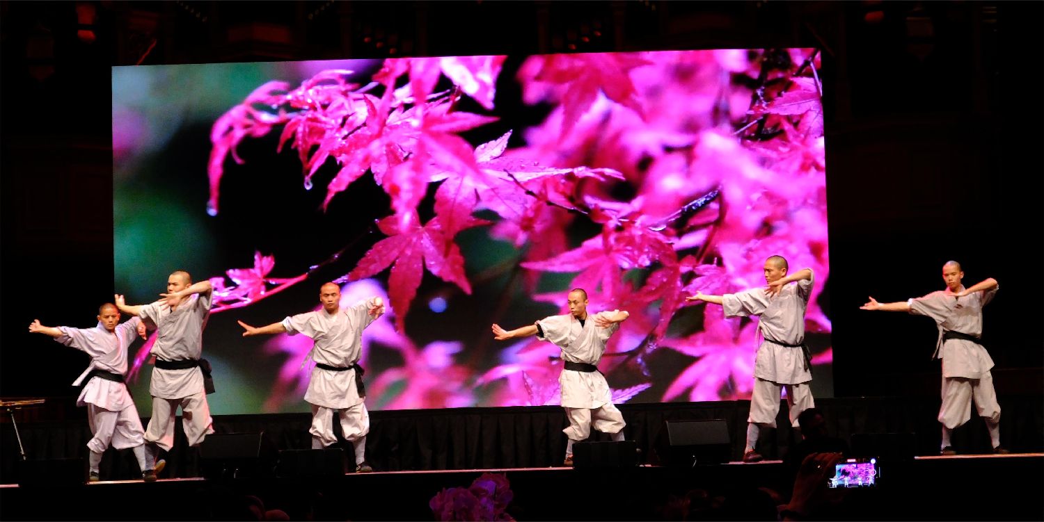 当地时间12月2日晚,中国嵩山少林寺方丈释永信率团在悉尼市政厅举行2023大洋洲少林考功大赛颁奖典礼,少林武僧团展示了少林八段锦、童子功、地趟拳、象形拳、醉拳、醉剑、二指禅等。图为颁奖典礼现场的武术展示。图片来源:澳洲网