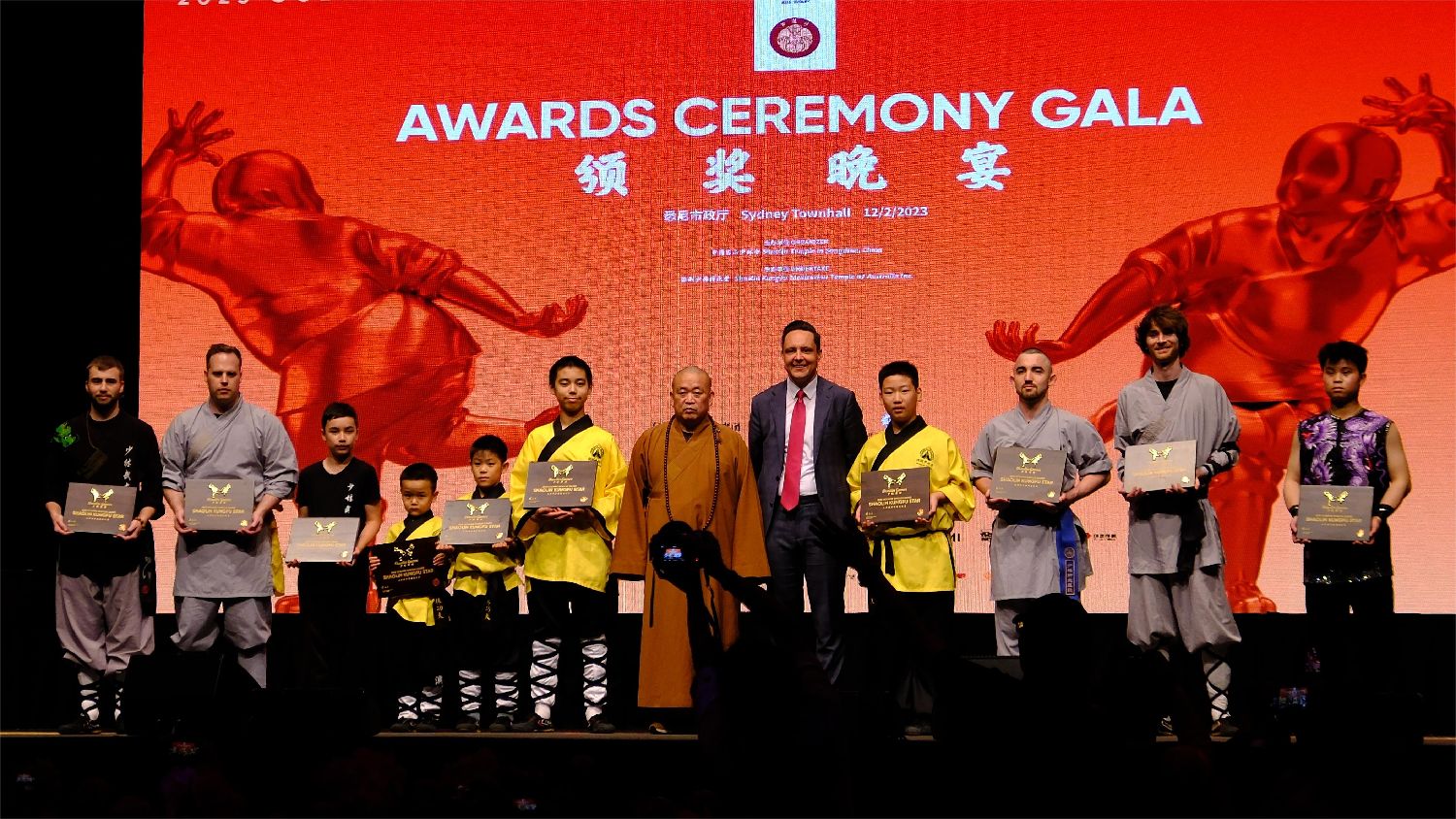 当地时间12月2日晚,中国嵩山少林寺方丈释永信率团在悉尼市政厅举行2023大洋洲少林考功大赛颁奖典礼。释永信向大赛评选出的“十大功夫之星”个人及团体颁发获奖证书。图片来源:澳洲网