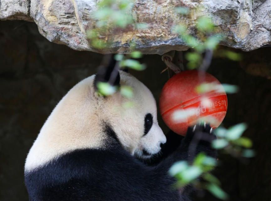 11月10日,大熊猫“怡兰”在澳洲阿德莱德动物园玩耍。图片来源:新华网