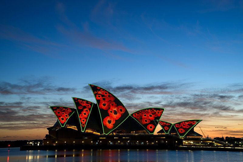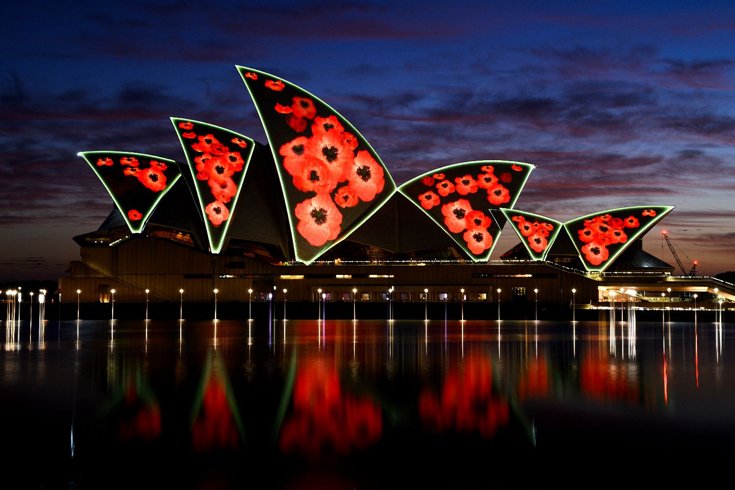 11月11日是阵亡将士纪念日,在悉尼歌剧院举行的纪念日黎明仪式上,罂粟花图案投射在悉尼歌剧院的帆形屋顶上,缅怀为国捐躯的将士们。(CFP)