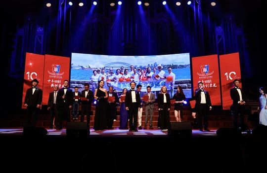 澳洲东北总商会十周年庆典6日晚在悉尼举行,来自中澳政界、商界及侨界代表500余人出席活动。庆典现场,中澳乐器合奏《象王行》、经典歌曲演唱《咱们屯里的人》以及原创主题曲首演《同心远航·Voyage》等节目将活动气氛逐步推向高潮。期间,商会颁发了终身成就、企业功勋、杰出贡献、青年领袖等多个奖项,以表彰在商会发展和社区建设中作出突出贡献的个人与机构。图为澳洲东北总商会十周年庆典现场。图片来源:人民网