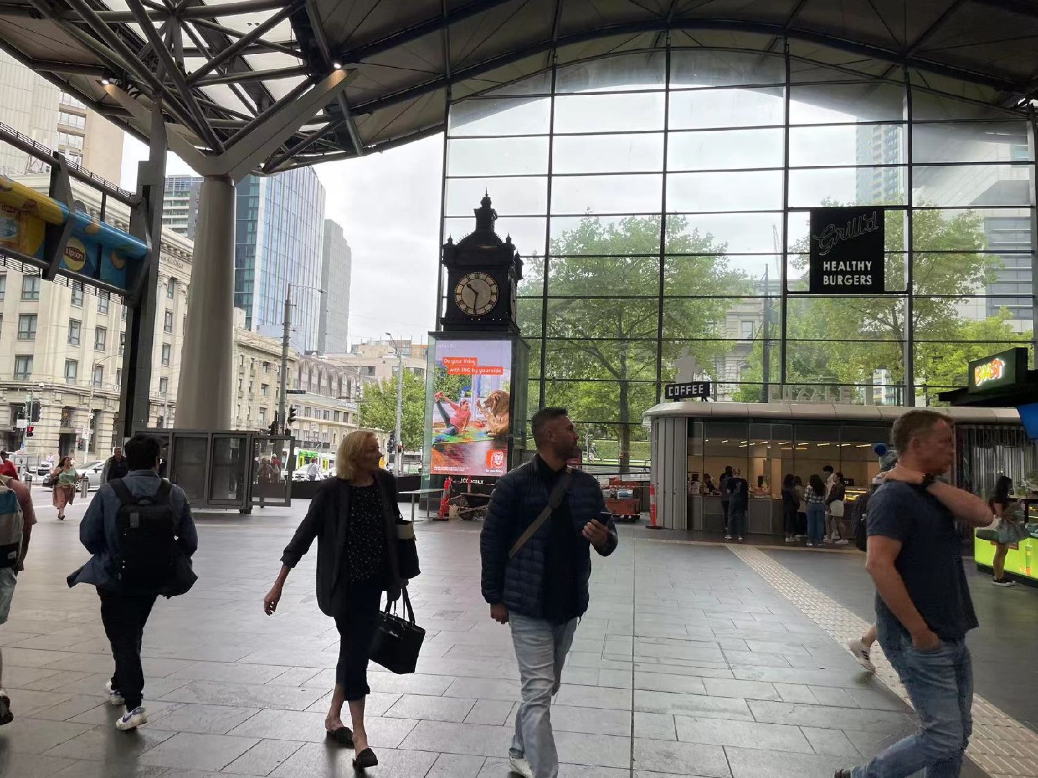 近日,大洋传媒记者拍摄了一组墨尔本的southern cross火车站图片。图为southern cross火车站内出行的民众。图片来源:大洋传媒记者 摄