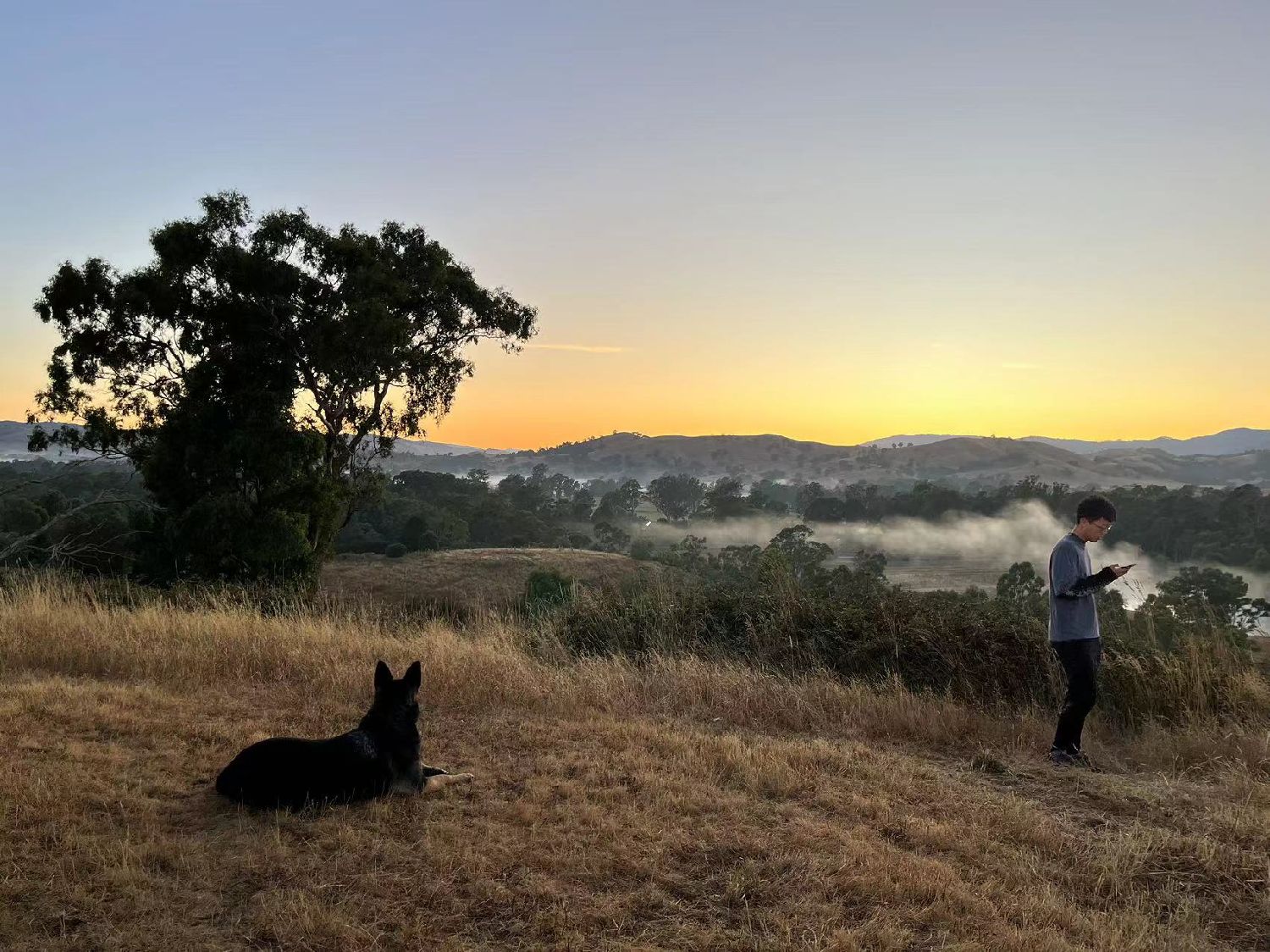 近日,大洋传媒记者拍摄了一组墨尔本梦幻山庄的美景图片。图为墨尔本民众带爱犬在梦幻山庄游玩。图片来源:大洋传媒记者 摄