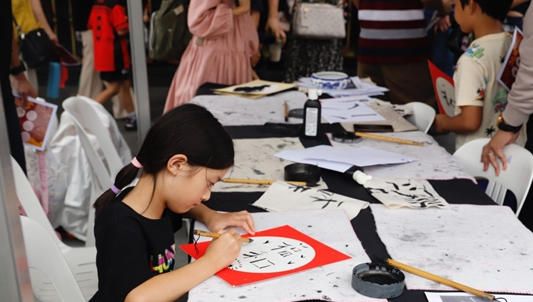 观众现场体验书法写作。图片来源:人民网