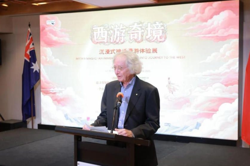 3月26日,由悉尼中国文化中心、中国驻悉尼旅游办事处联合广西师范大学出版社集团有限公司共同主办的“西游奇境:沉浸式神话漫游体验展”在悉尼中国文化中心成功举办。图为澳洲水彩画协会主席大卫·范·努恩(David Van Nunen OAM)致辞。图片来源:中国日报网