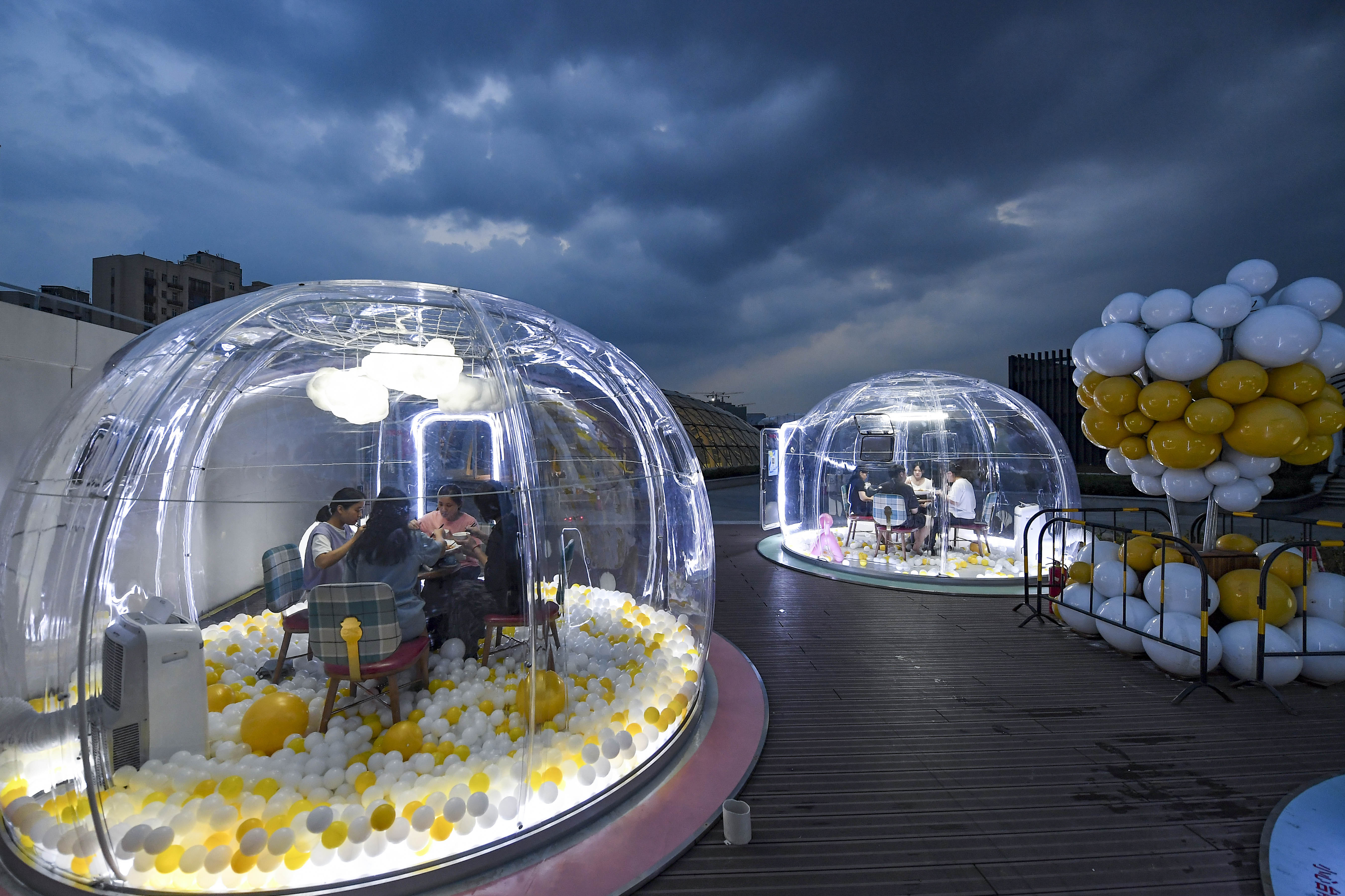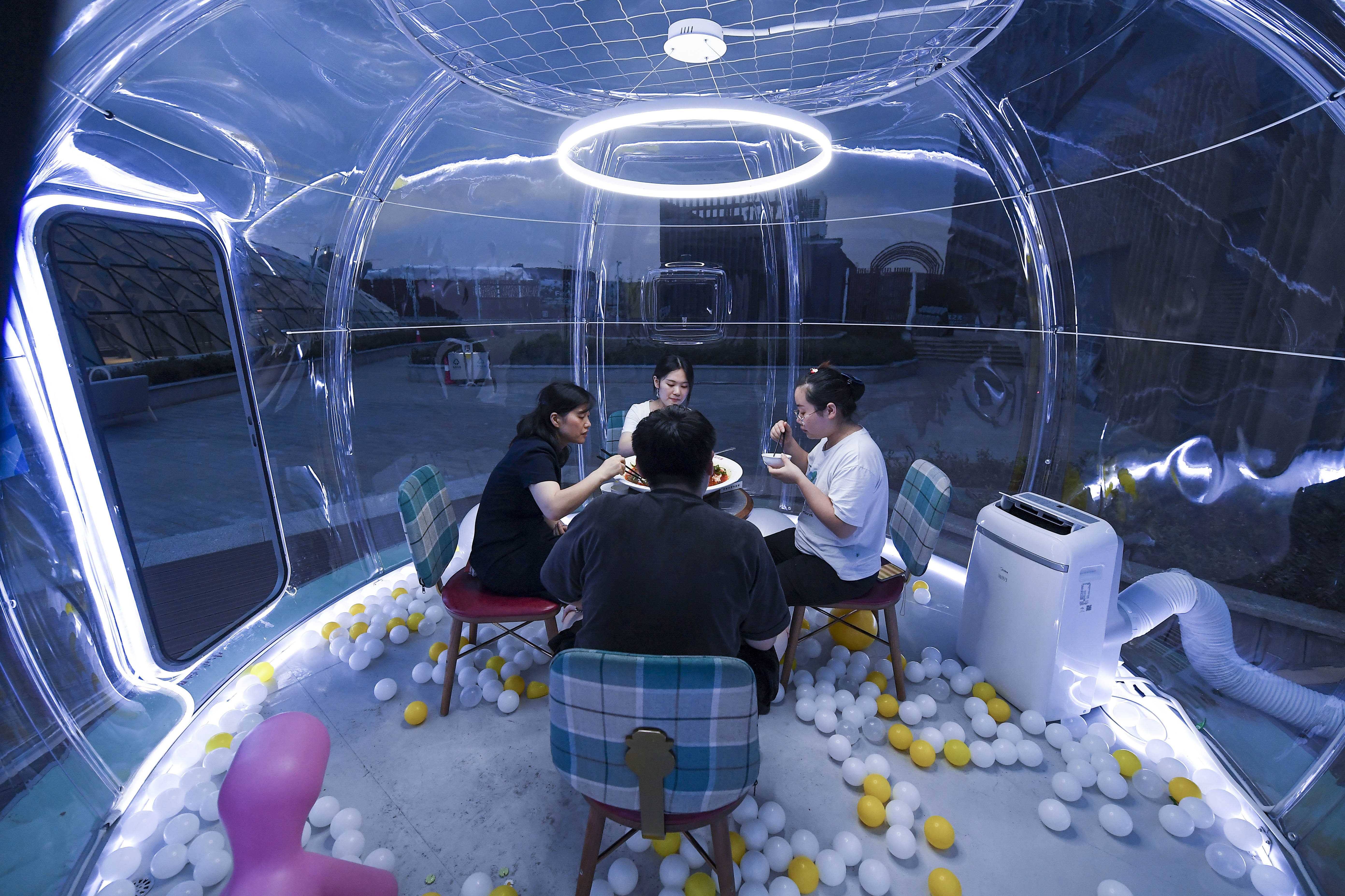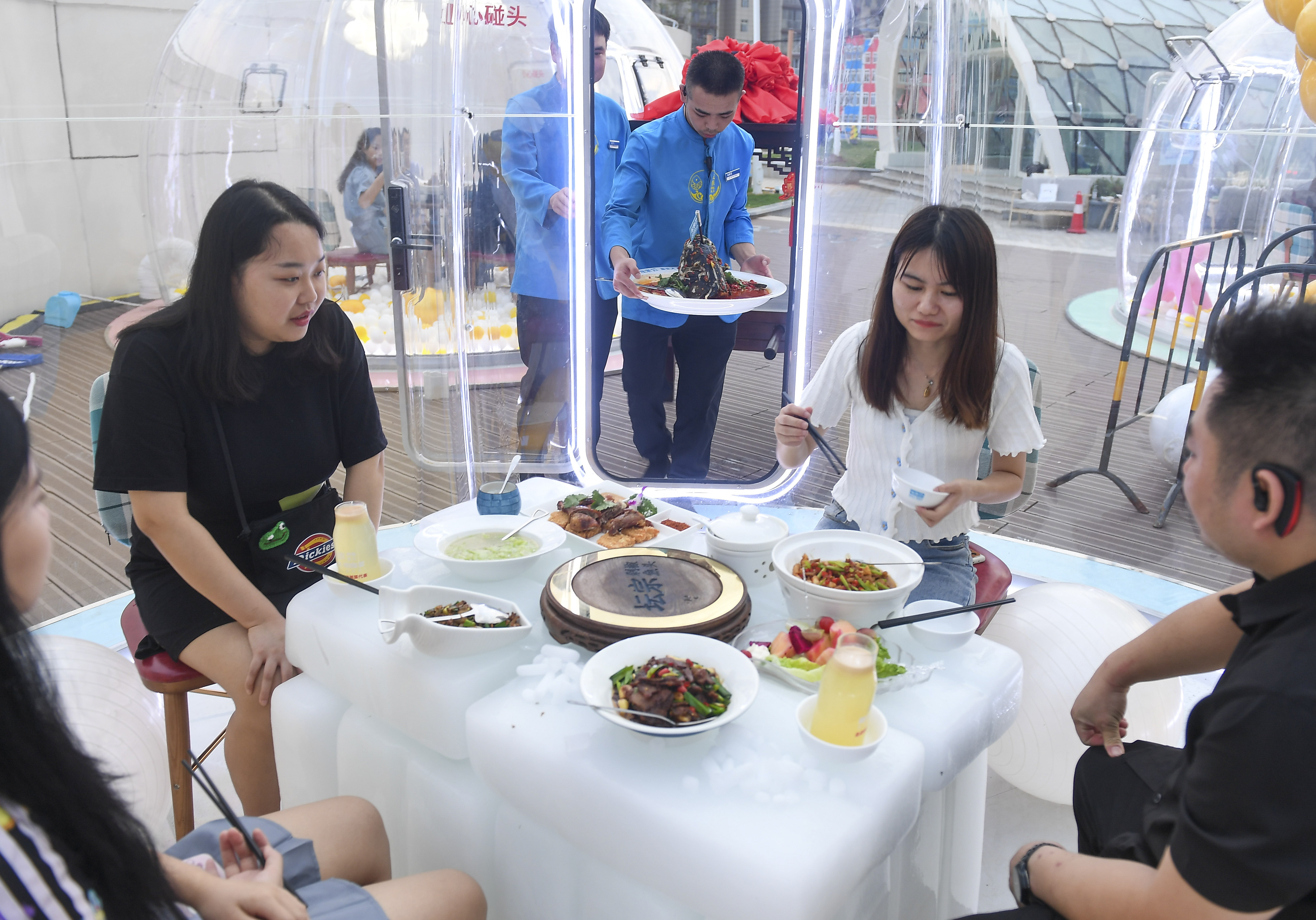 7月19日,中国长沙市民在泡泡冰屋内品尝美食。当晚,长沙一商场天台推出泡泡冰屋晚餐,为炎热的夏季消暑降温。市民们在冰屋内品尝各种热辣辣的湘菜,感受“冰火两重天”。(图片来源:中新网)