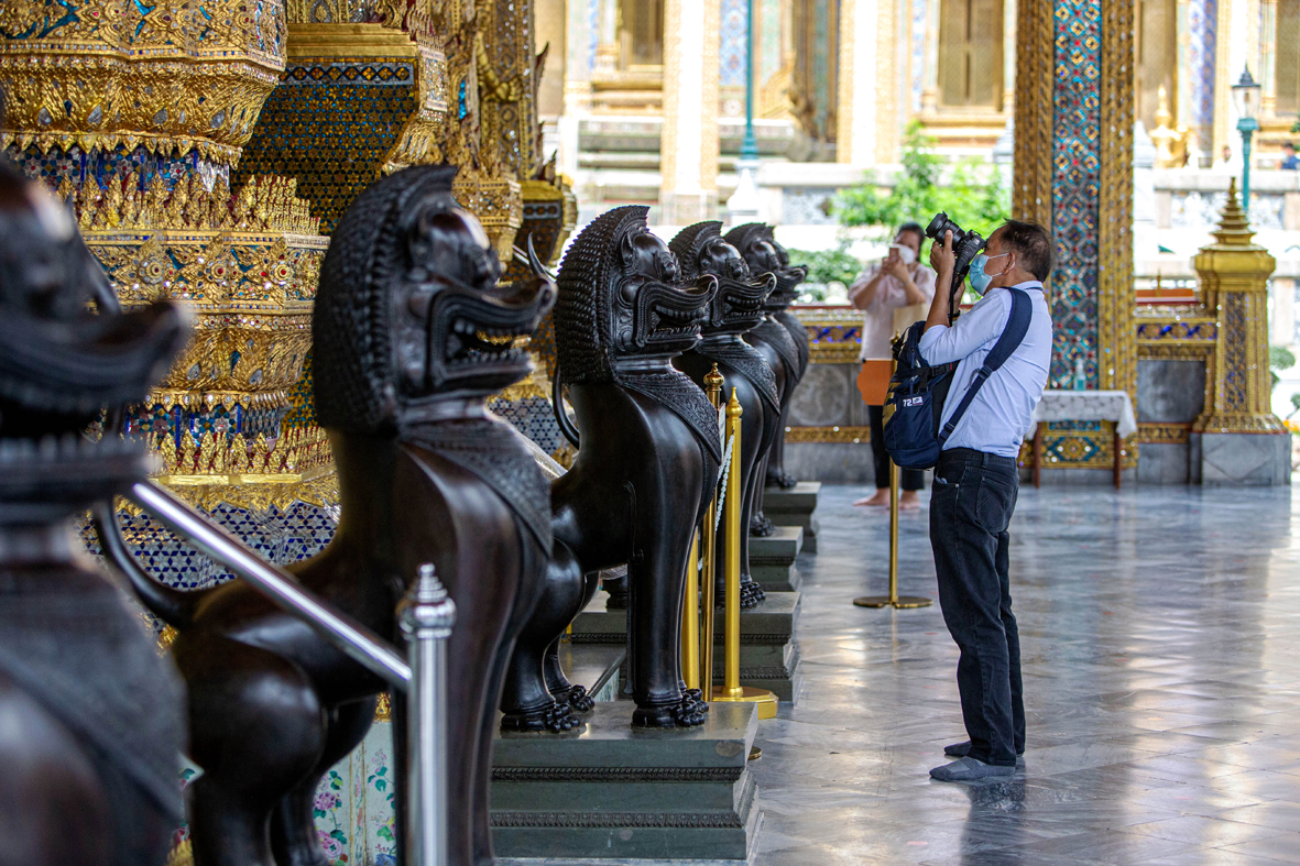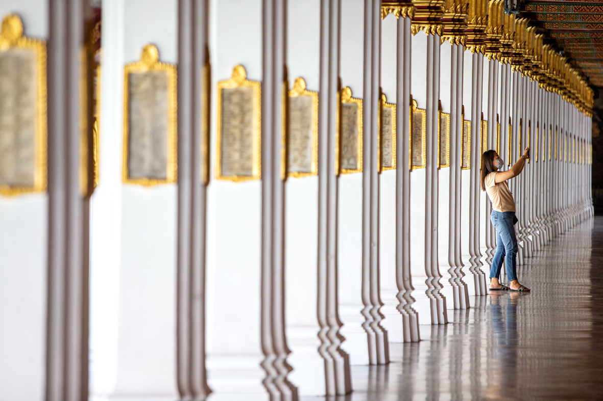 11月1日,一名游客在泰国曼谷大皇宫景区拍照。 泰国曼谷11月1日起重新开放因新冠疫情关闭的大皇宫景区,允许民众在遵守防疫措施的前提下参观游览。图片来源:新华社