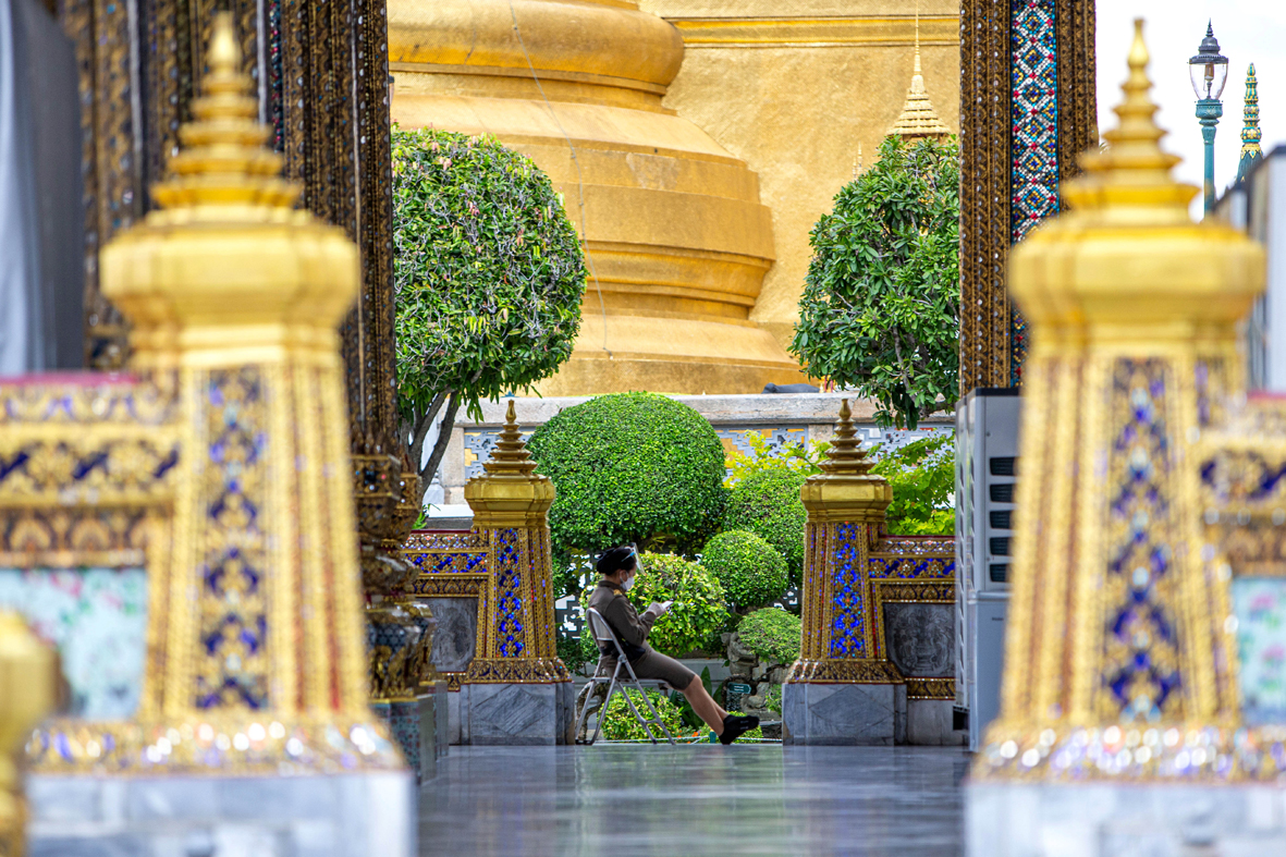 11月1日,一名工作人员在泰国曼谷大皇宫景区值班。图片来源:新华社