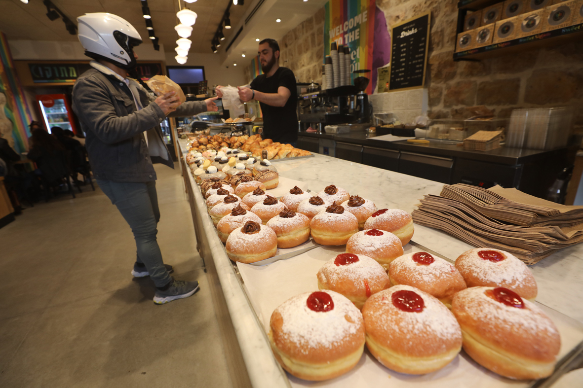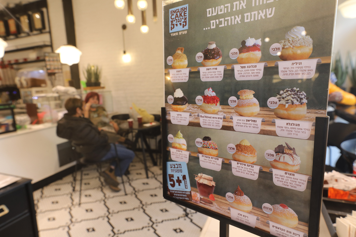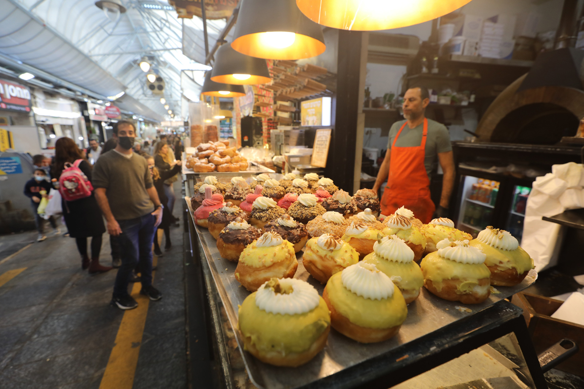 12月6日,耶路撒冷一家食品店出售各种口味的光明节面包圈。图片来源:新华社