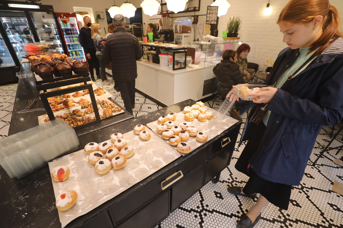 这是12月6日在耶路撒冷拍摄的光明节面包圈。 这种甜甜的油炸面包圈是犹太传统节日光明节期间特有的食品。图片来源:新华社