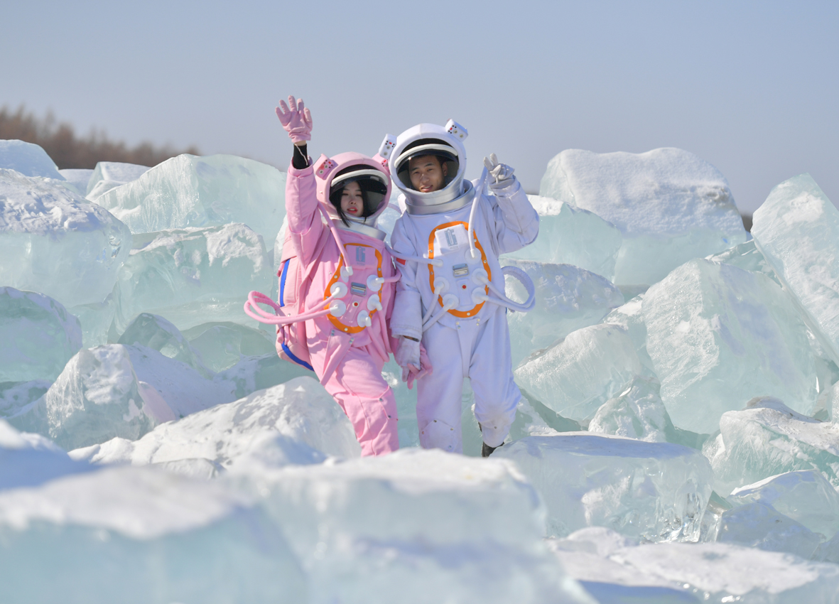 2月23日,在长春净月潭国家森林公园内,由水库天然冰块堆砌而成的“蓝冰”景观,吸引市民打卡拍照。“蓝冰”又称“冰川冰”,主要指南极附近经过漫长岁月形成的致密坚硬冰川,由于光的散射,使波长较短的蓝光呈现在眼中,从而有了蓝冰之说。图片来源:澳洲网