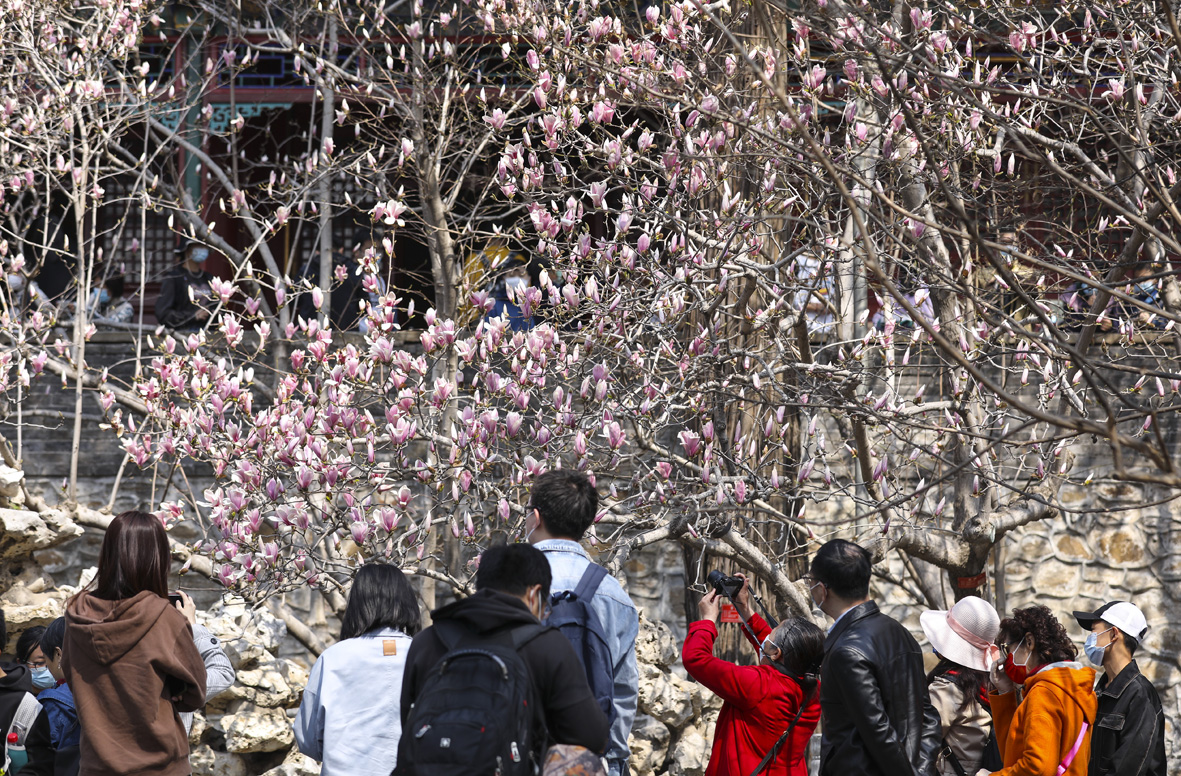 4月4日,市民在北京潭柘寺景区拍摄盛开的玉兰花。近日,潭柘寺景区的玉兰花竞相绽放,吸引众多市民前来观赏。图片来源:澳洲网