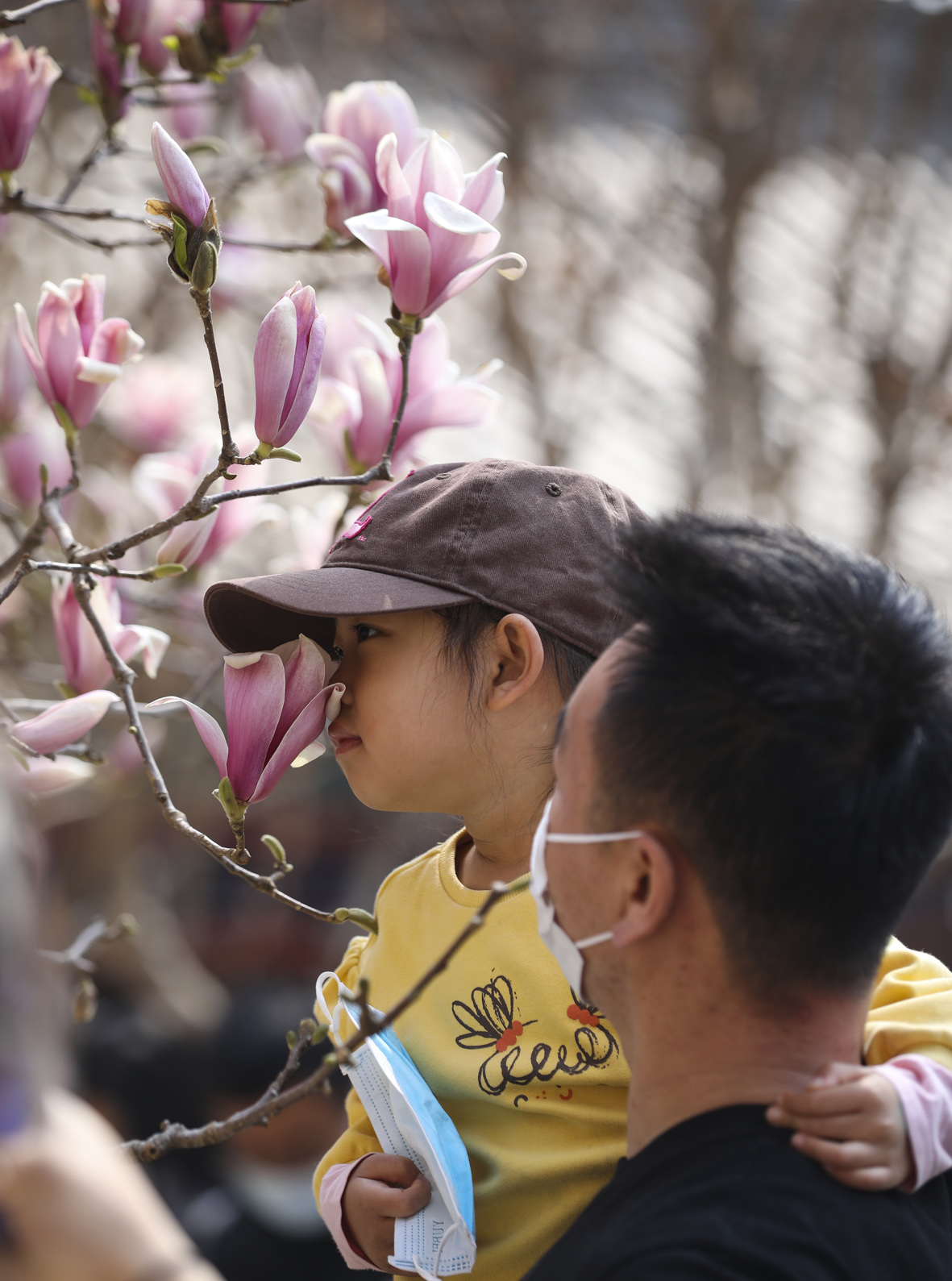 4月4日,一名小朋友摘下口罩,细嗅玉兰花香。图片来源:澳洲网