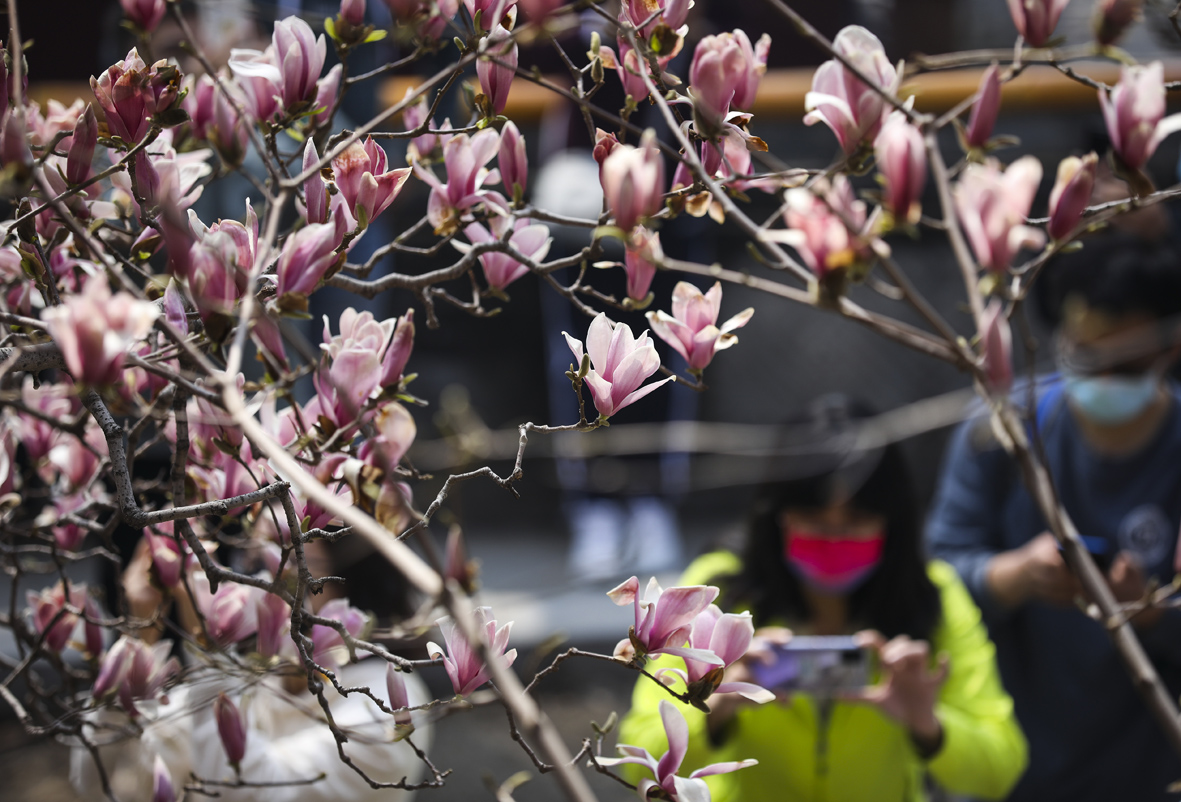 4月4日,市民在北京潭柘寺景区拍摄盛开的玉兰花。图片来源:澳洲网