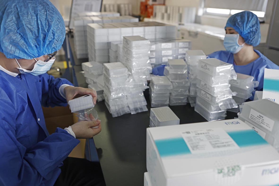 4月11日,工作人员在拆解核酸检测试剂盒。图片来源:澳洲网