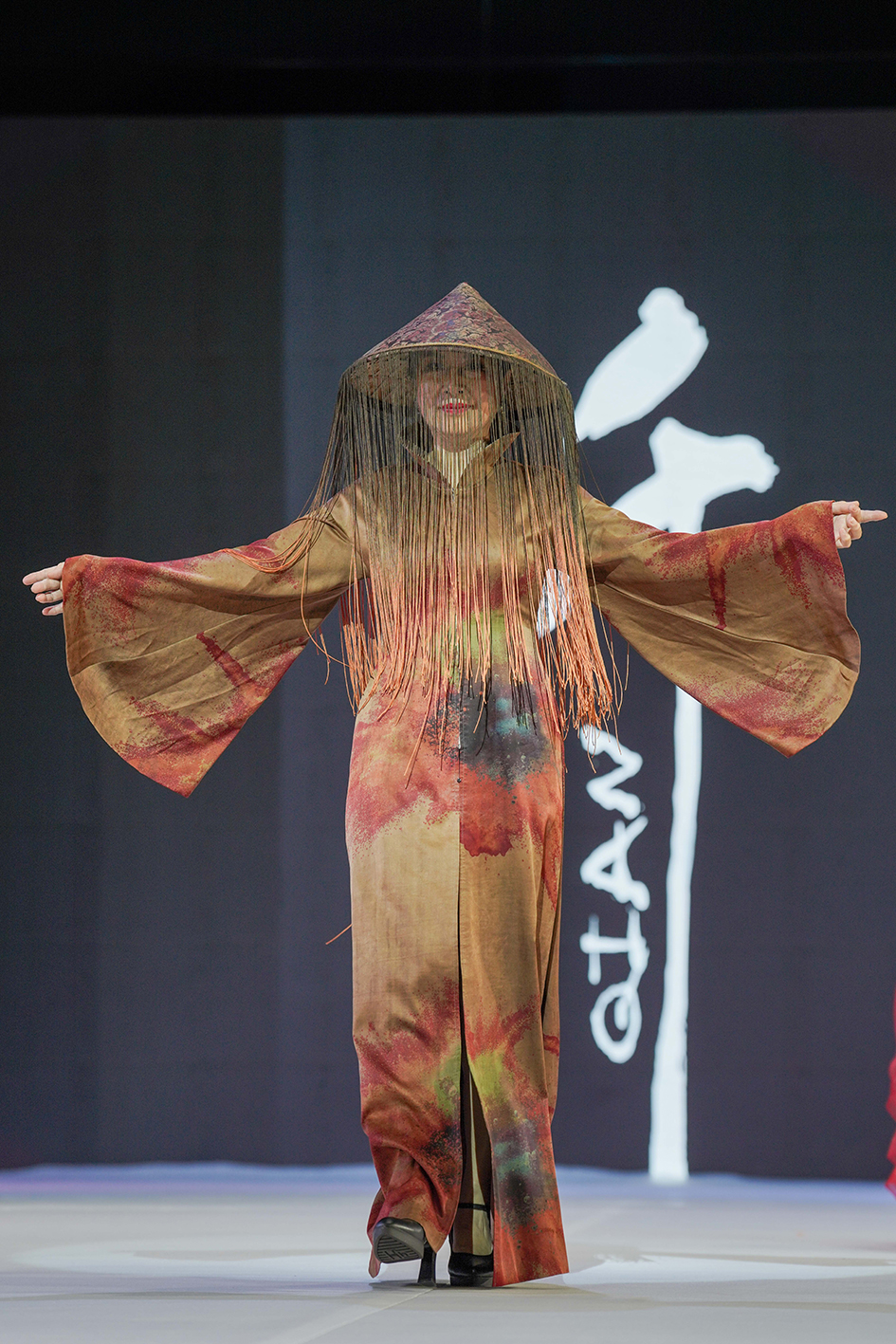 图为模特穿着斗笠与现代潮服结合的服饰走秀。图片来源:澳洲网