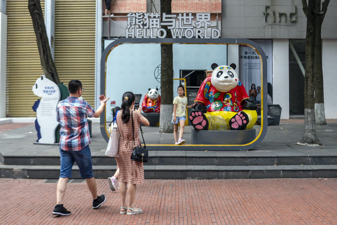 7月10日,四川成都,孩子与熊猫雕像合影。图片来源:澳州网