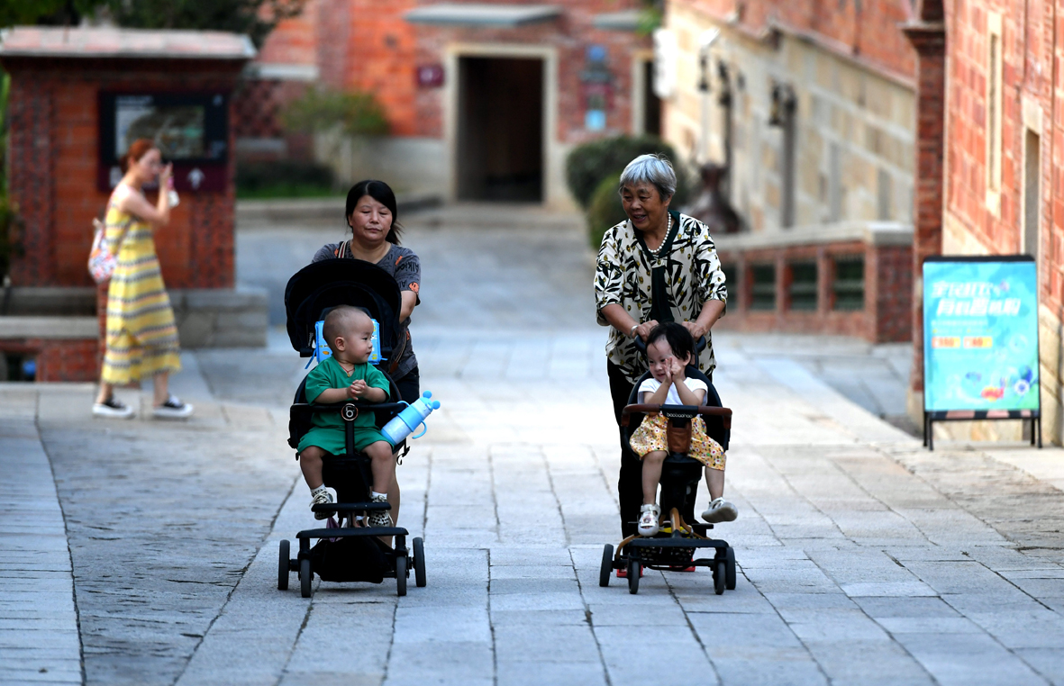 9月14日,福建晋江,两位老奶奶带着孙子、孙女在五店市游览。图片来源:澳洲网