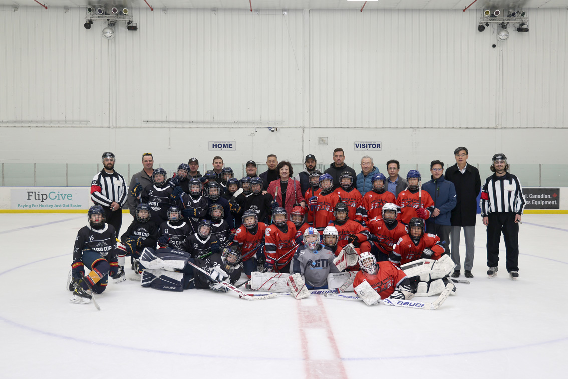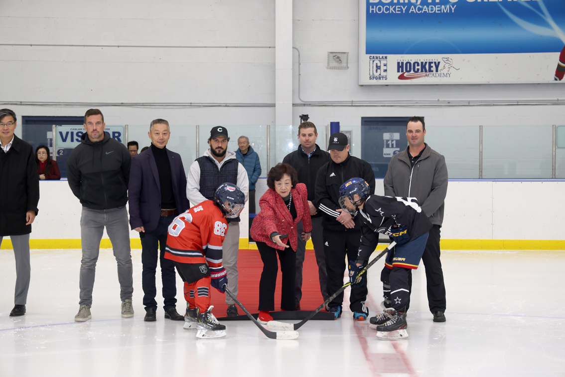 当地时间10月2日,为庆祝新中国73周年华诞,北美青少年冰球联合会在加拿大多伦多举办“金秋青少年冰球友谊赛”,由华人小球员队伍对阵当地青少年冰球劲旅。图为北美青少年冰球联合会主席韩进雯为比赛开球。图片来源:澳洲网