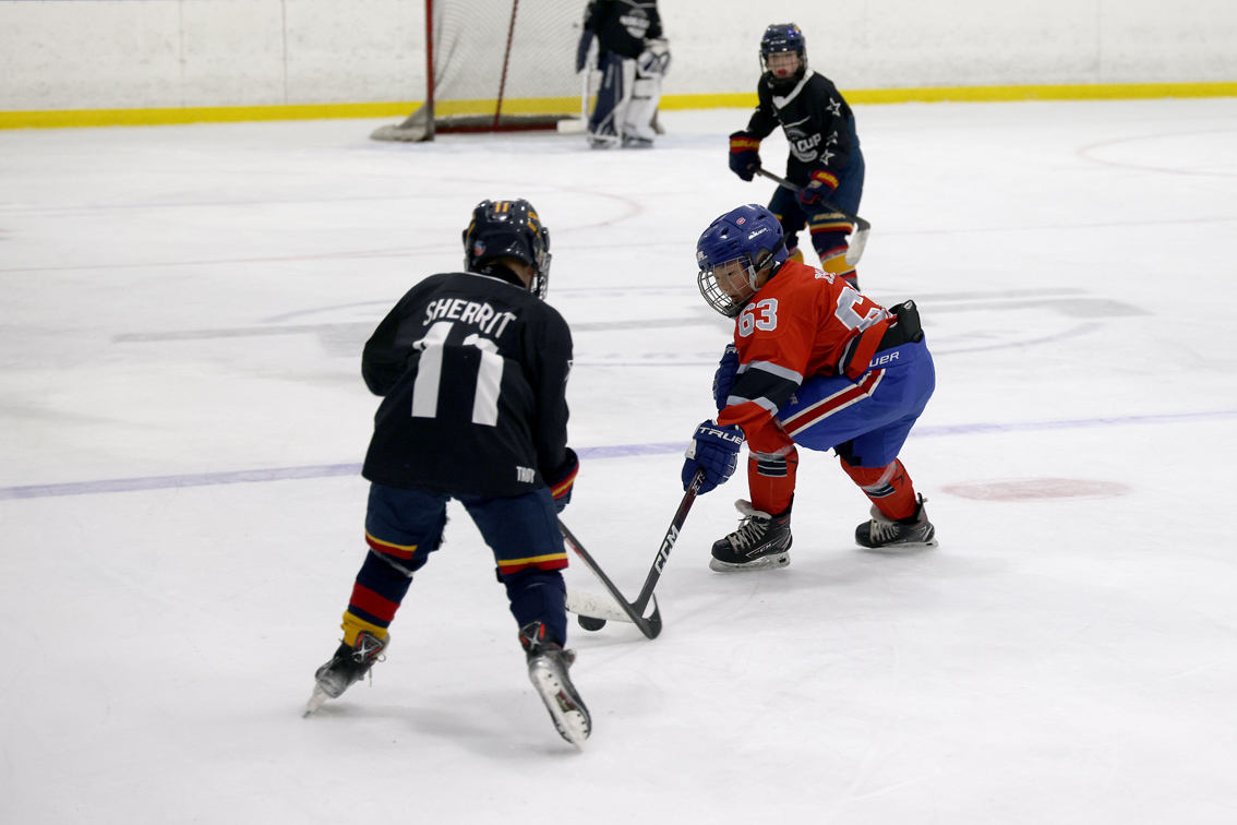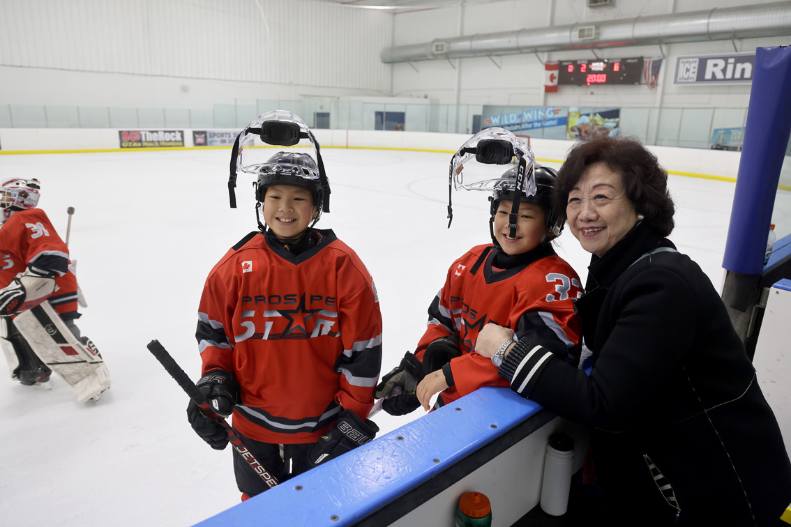 图为北美青少年冰球联合会主席韩进雯(右一)为华人小球员加油打气。图片来源:澳洲网