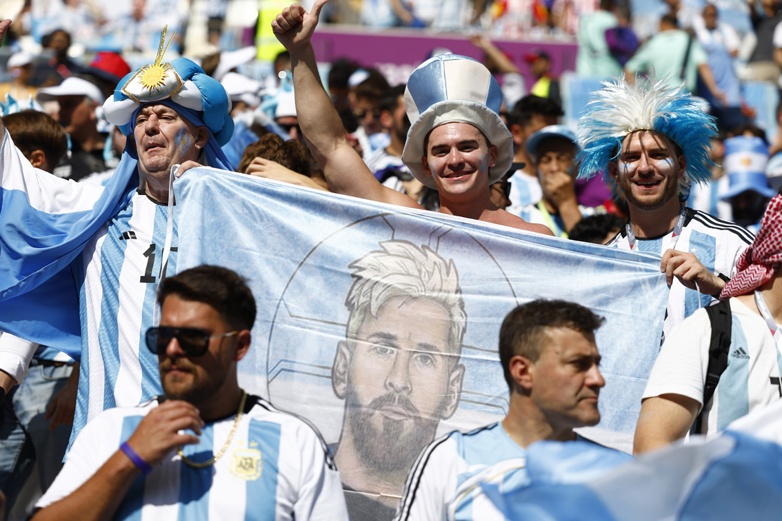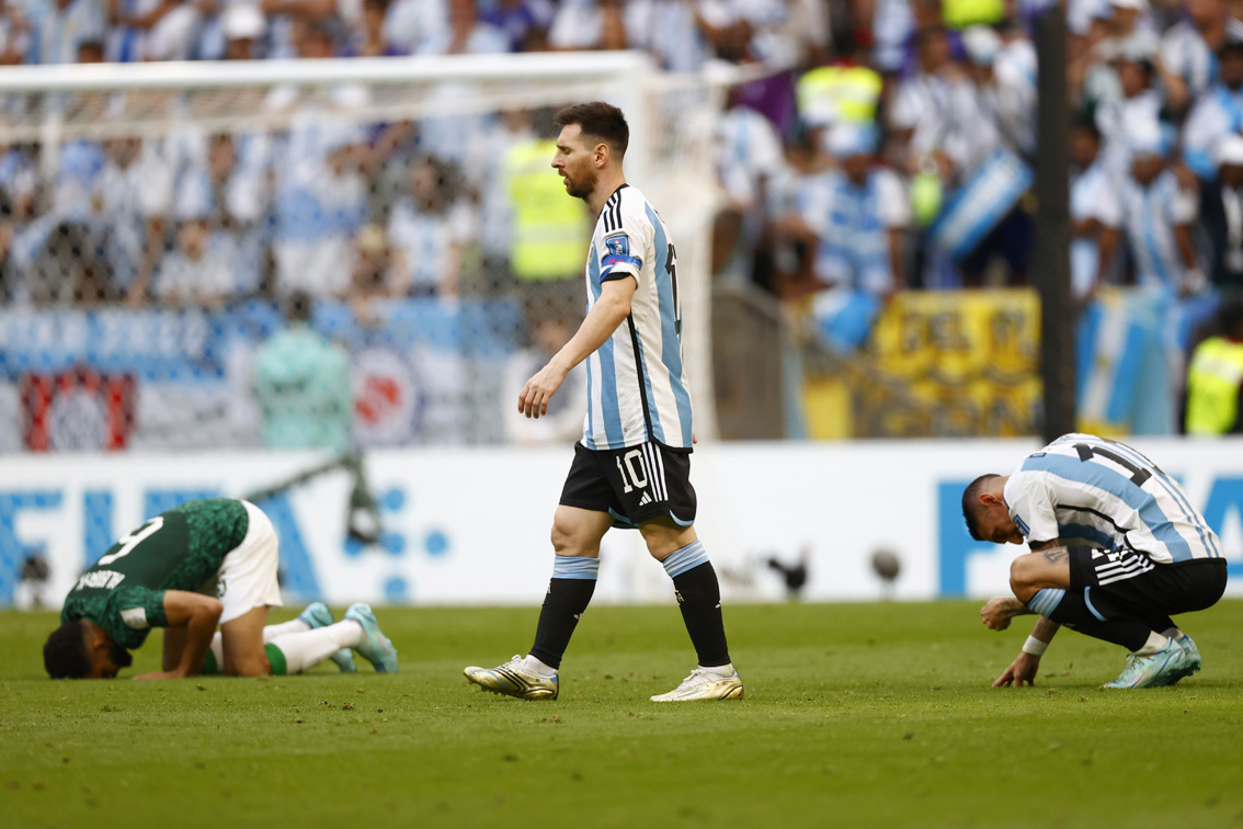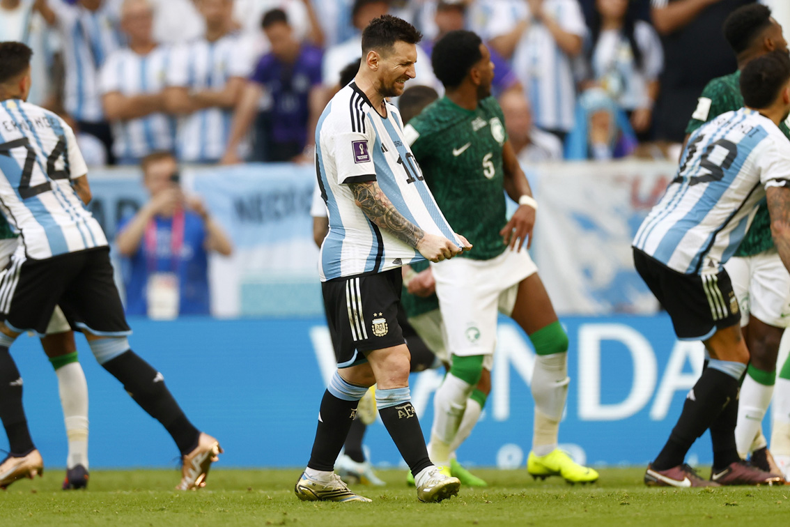 当地时间11月22日,2022卡塔尔世界杯小组赛C组首轮阿根廷(蓝)与沙特阿拉伯的比赛在卢赛尔体育场举行。最终阿根廷队1:2不敌沙特阿拉伯队。图为阿根廷球员梅西(左二)在比赛中。图片来源:澳洲网