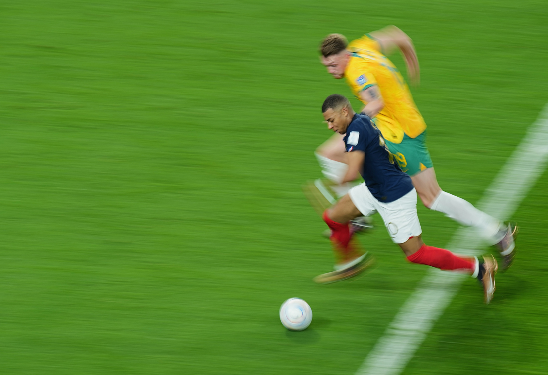 当地时间11月22日,2022卡塔尔世界杯小组赛D组首轮法国队与澳大利亚队比赛在艾华卡拉贾努布体育场举行。法国队4-1胜澳大利亚队。图为法国队球员姆巴佩(蓝)在比赛中带球突破。图片来源:澳洲网