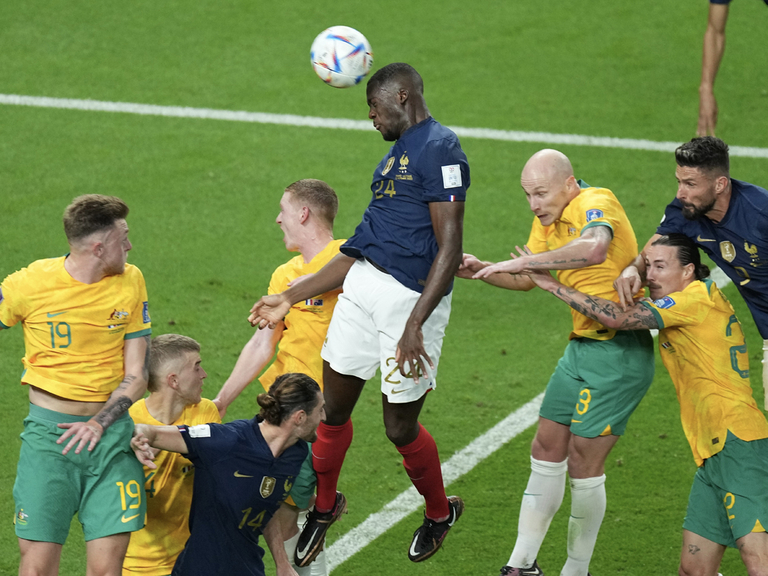 图为法国队球员科纳特(蓝,24号)在比赛中争得头球。图片来源:澳洲网