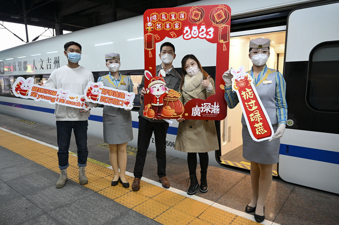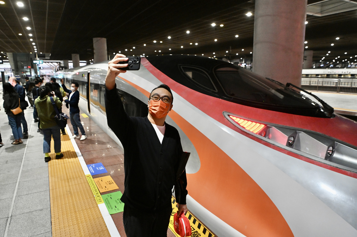 1月15日,广深港高铁香港段正式恢复运营。香港西九龙站早上6时许,旅客进入西九龙站等候乘坐高铁前往内地。图为旅客抵达深圳北与动感号列车自拍。图片来源:澳洲网