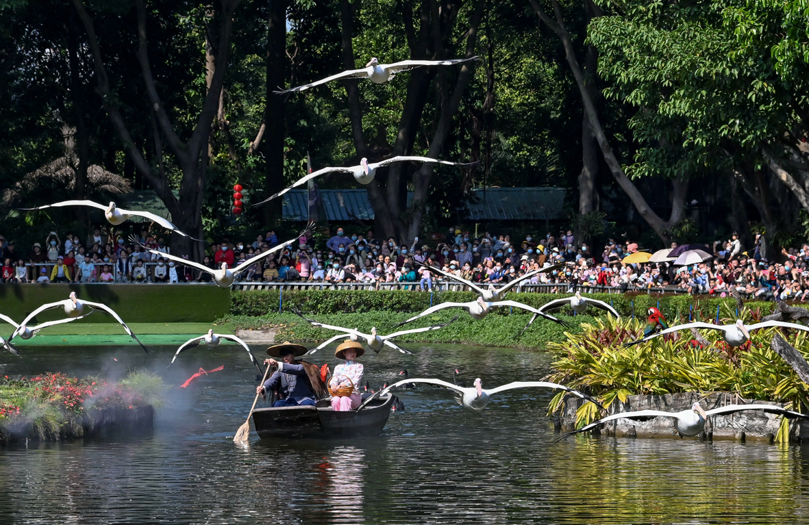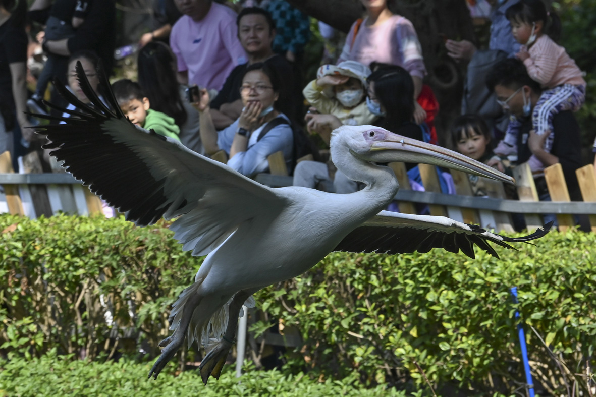 2月2日,广东省广州市,飞翔的白鹈鹕吸引游客。当日是“世界湿地日”,广州长隆旅游区举办“百鸟飞歌”活动,向游客近距离展示飞鸟的灵动之美。图片来源:澳洲网