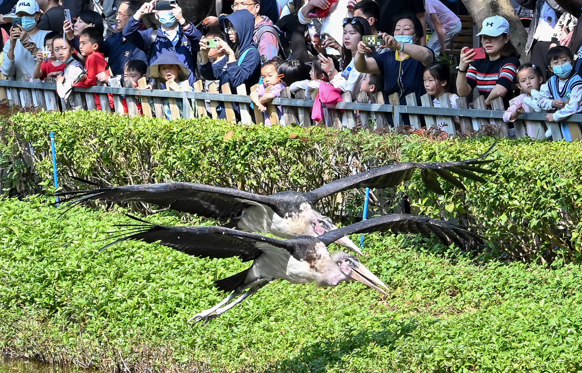 2月2日,广东省广州市,两只飞翔的非洲秃鹳吸引游客。图片来源:澳洲网