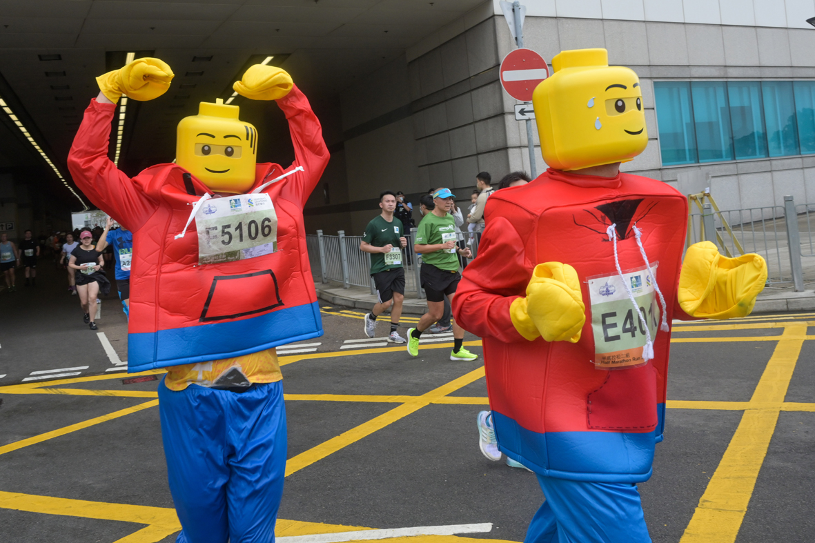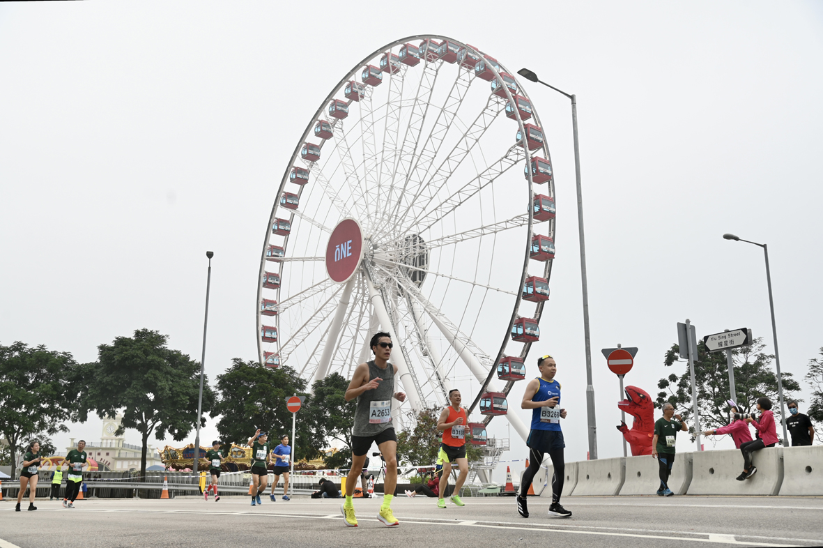 2月12日,香港渣打马拉松复办,吸引一众跑手于清晨开跑。当中,半马及全马赛事于尖沙咀弥敦道起步,10公里赛事于东区走廊起跑,以铜锣湾维多利亚公园为终点。图为跑手与香港摩天轮。图片来源:澳洲网
