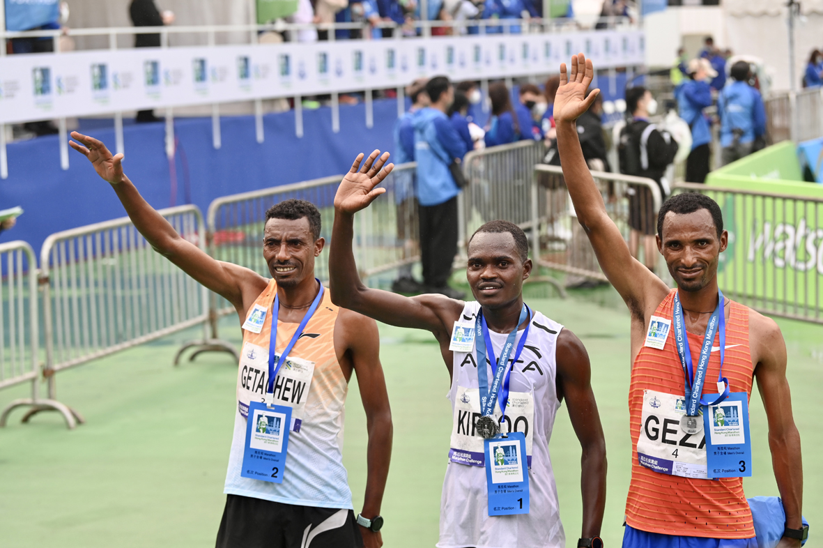 图为马拉松全马赛事男子组冠军(中)、亚军(左)及季军。图片来源:澳洲网