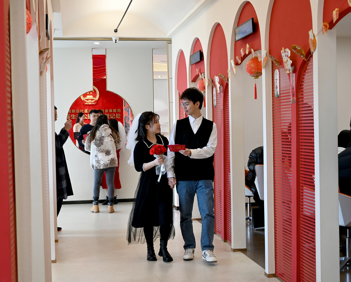 2月14日,办完结婚手续的新人。当日,不少新人来到四川省成都市高新区桂溪生态公园婚姻登记处办理结婚登记手续。图片来源:澳洲网