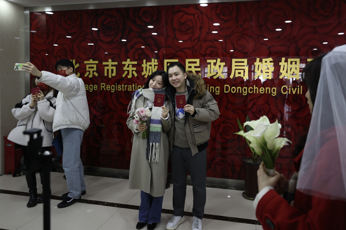 2月14日,在北京市东城区民政局婚姻登记处,不少新人前来登记结婚。图为新人领取结婚证后拍照留念。图片来源:澳洲网