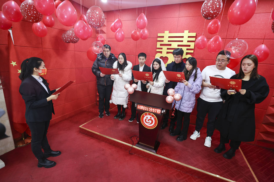 2月14日,山西省太原市万柏林区民政局婚姻登记处,新人们领取结婚证后集体宣誓。当日,不少新人前来登记结婚。图片来源:澳洲网