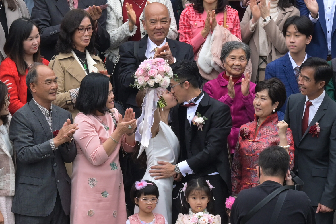 2月14日为情人节,香港有新人到中环大会堂婚姻登记处登记结婚,接受亲友祝福。根据香港入境事务处数字,共有248对新人递交拟结婚通知书,打算在情人节登记结婚,比去年同期增加一倍。图为新娘高举花球与新郎亲吻。图片来源:澳洲网
